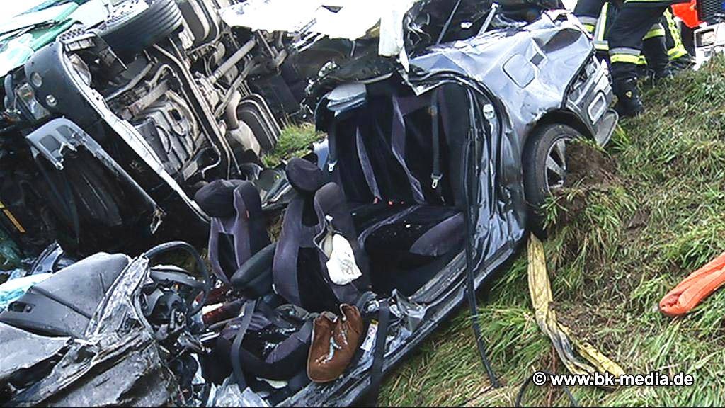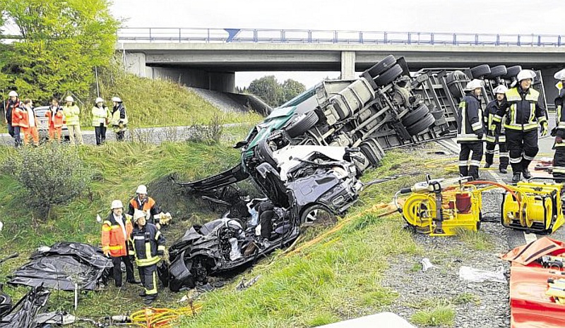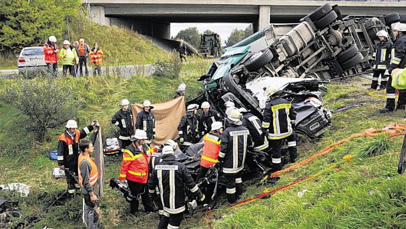 Leuchtenberg. (phs) Selbst hartgesottene Feuerwehrleute und Sanitäter mussten kräftig schlucken. Am frühen Donnerstagnachmittag begrub ein Lastwagen auf der B 22 bei Wieselrieth eine Familie aus Niederbayern in ihrem Toyota Avensis unter sich. Im Wrack starben ein Ehepaar und dessen Sohn. Die Retter gingen zunächst von drei jungen Männern aus, so fürchterlich hatte der Laster das Auto zertrümmert. |